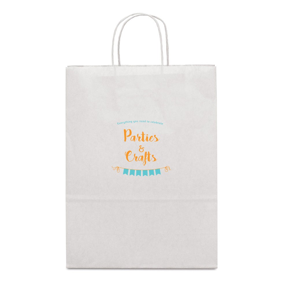 Sac en papier kraft 90g/m² avec anses torsadées. Cet article est fabriqué à partir de matériaux certifiés FSC™ et d’autres matériaux certifiés. Fabriqué au Portugal.
