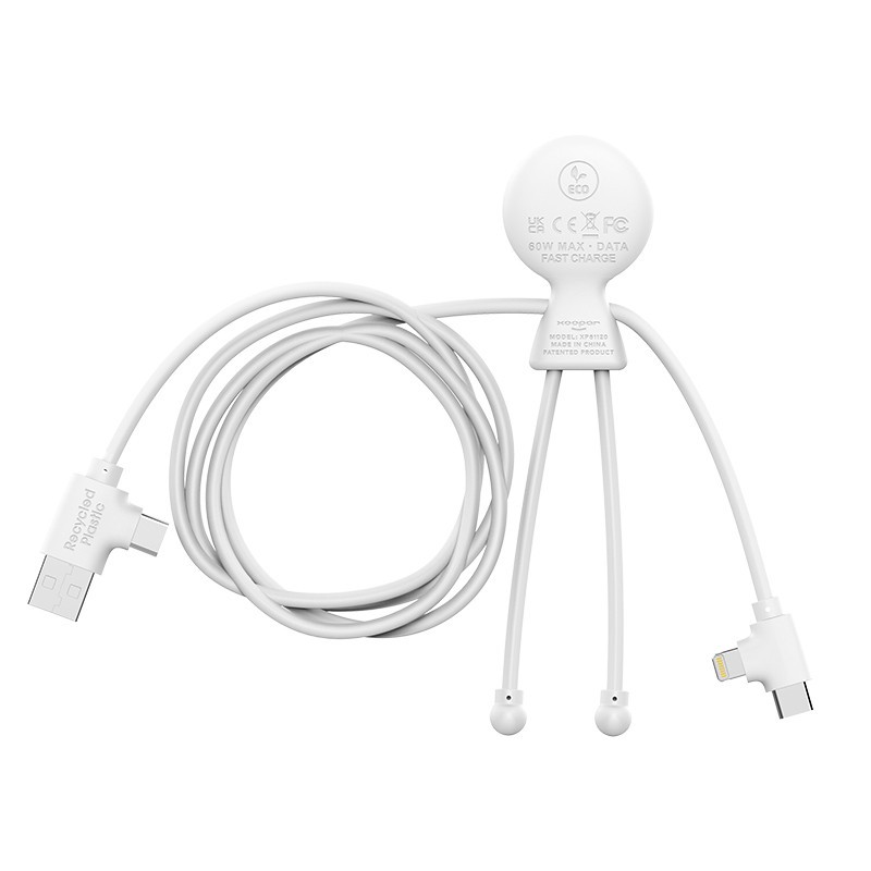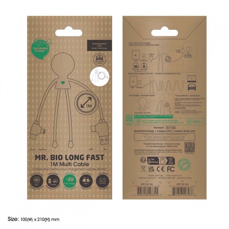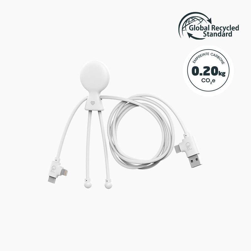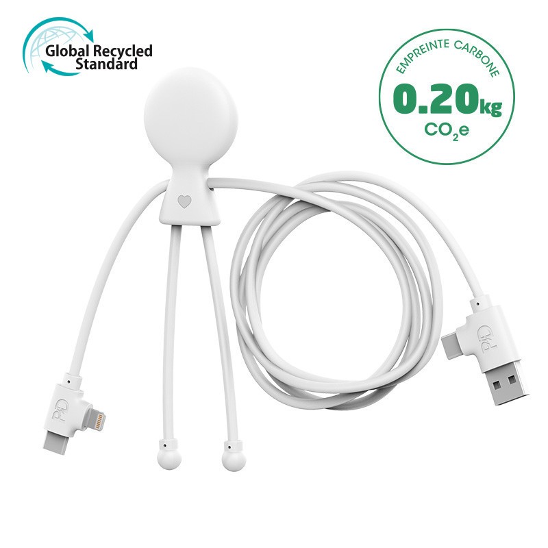 Le Mr bio long fast GRS permet de charger rapidement vos appareils, de l’utiliser dans la voiture (fonctionnalité Carplay) et de transférer vos données en un clic (DataTransfer). Multi-câbles d’un mètre de long, entrée : USB-C et USB et sortie : Lightning, USB-C. Charge rapide lorsque le produit est combiné à une tête de charge de 20W. Celle-ci permet de recharger 50% de votre smartphone en moins de 30 mn, lorsque le câble est en charge rapide, le coeur s’allume et une Led verte apparaît. Fonctionnalité CarPlay, compatible avec tous les appareils dernière génération. Fabriqué en Chine. 20% du volume total du produit est fabriqué à partir de plastique recyclé, packaging en papier certifié FSC issu d’une exploitation forestière disposant d’une gestion durable et audit carbone réalisée sur le cycle de vie du produit selon la norme ISO 14067 : 0.20g de CO2 dégagés sur tout le cycle vie du produit, soit autant d’émissions qu’un trajet de 85km en TGV. Fabriqué en Chine.