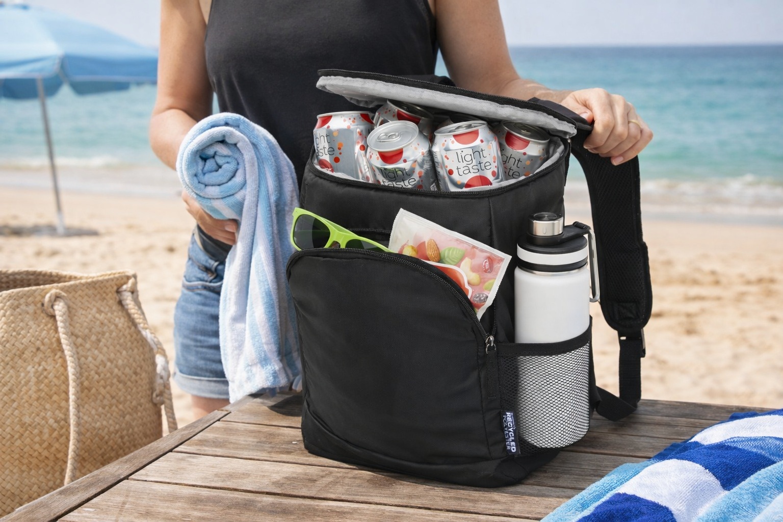 Réalisé avec une isolation thermique haute densité, ce sac à dos dispose d’un compartiment principal zippé, d’une poche frontale zippée, d’une poche latérale maille filet et de bretelles matelassées ajustables. Anti fuite, doublure PEVA facile à nettoyer. Peut contenir 18 canettes. Sans PVC. Fabriqué en polyester 420D recyclé certifié GRS en Chine et imprimé en Europe.