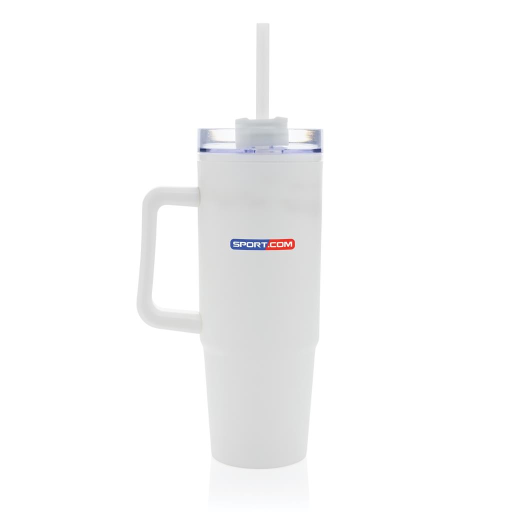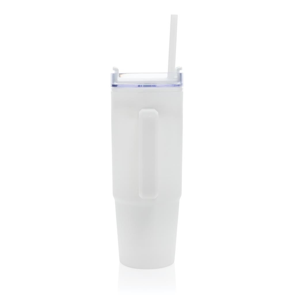 Mug 900ml en plastique à double paroi Tana, fabriqué à partir de 80 % de matériaux recyclés pour une hydratation à faible impact. Que vous travailliez, fassiez de l’exercice ou voyagiez, ce gobelet est votre compagnon idéal. Le couvercle avancé est doté d’un bouchon rotatif à trois positions : une paille anti-éclaboussures, un bec verseur et un couvercle entièrement scellé. La poignée ergonomique avec inserts confort-grip facilite le transport, et la base fine s’adapte à la plupart des porte-gobelets de voiture. Laver à la main uniquement. Contenu recyclé total : 80 % sur la base du poids total de l’article. Sans BPA. Emballage cadeau en kraft certifié FSC® inclus.