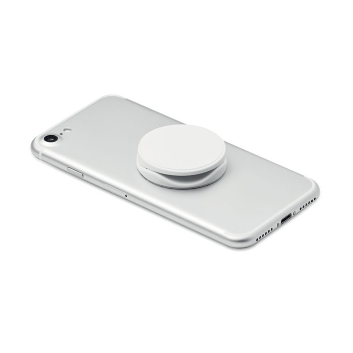 Accessoire téléphonique pliable de forme ronde en ABS avec fonction support et socle de téléphone. Autocollant 3M au dos du produit. Fabriqué en Chine.