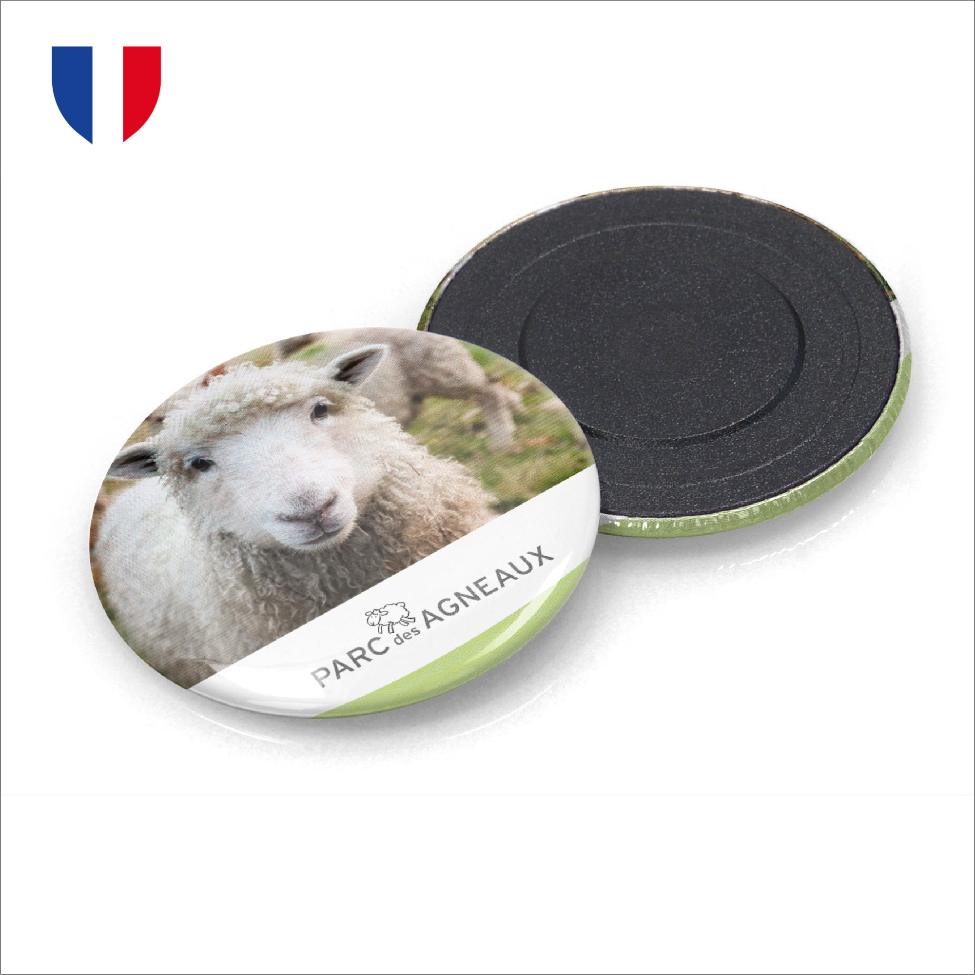 Plaque bombée en métal rond avec simple magnet épaisseur 1 mm collé au dos, livré en vrac. Fabriqué et imprimé en France. Une impression quadri + film Mylar brillant inclus (hors frais techniques).