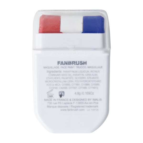 Stick maquillage tricolore bleu/blanc/rouge en plastique. Plus de 6M de maquillage. Origine végétale, sans MIT, alcool ou parabènes.