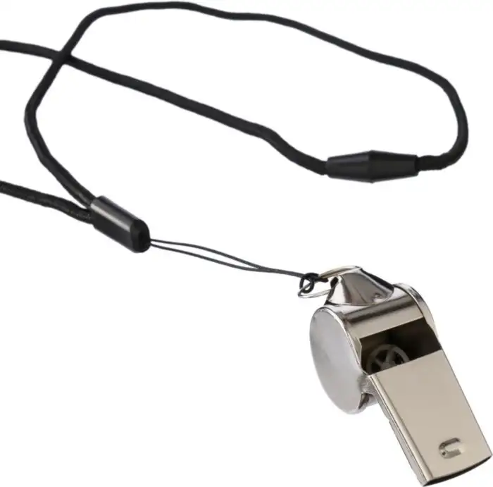 Sifflet tour de cou en métal avec cordon anti étranglement en polyester dans une boîte cadeau en kraft. Fabriqué en Chine.