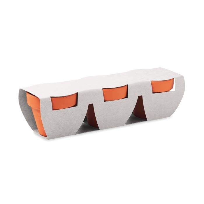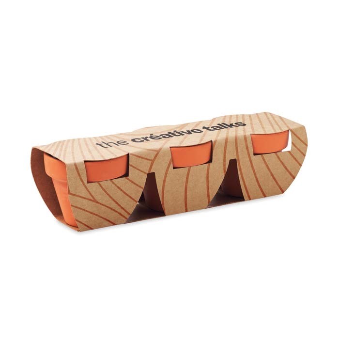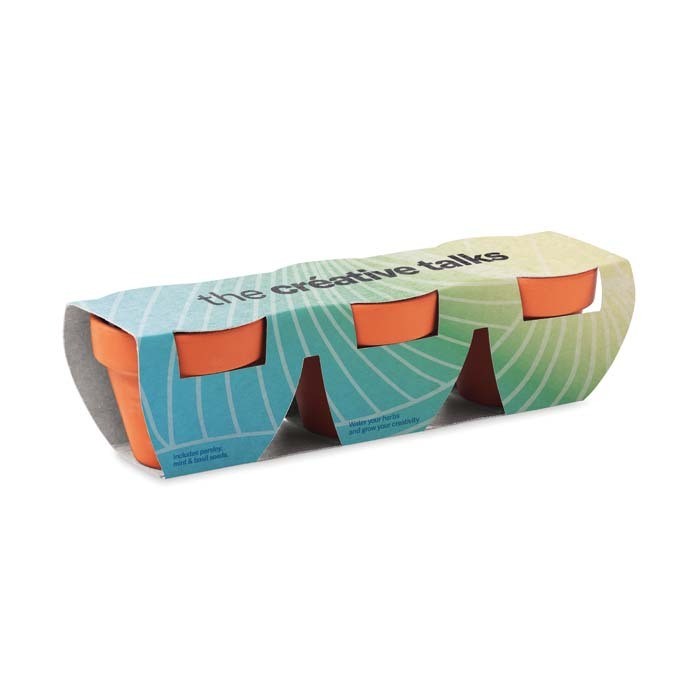 Set de trois pots en terre cuite Ø5 cm avec des pastilles de terre, des graines (à choisir parmi trois) et un emballage en papier de votre choix. Choisissez trois graines parmi les 18 proposées (tournesol, myosotis, coquelicot, maguerite daisies, croix de jérusalem, mélange de fleurs sauvages, mélange d’herbes, carottes, basilic, thym, persil, ciboulette, mélange de salade, radis, tomate, poivron, piment, fraise). Vous pouvez choisir les mêmes ou 3 types différents. Ajoutez votre design en couleur sur l’emballage en papier blanc ou kraft. Laissez le jardin d’herbes aromatiques, la serre ou le coin fleuri de votre client être un rappel constant de votre marque. Fabriqué en Europe Un marquage quadri sur emballage kraft et frais techniques inclus