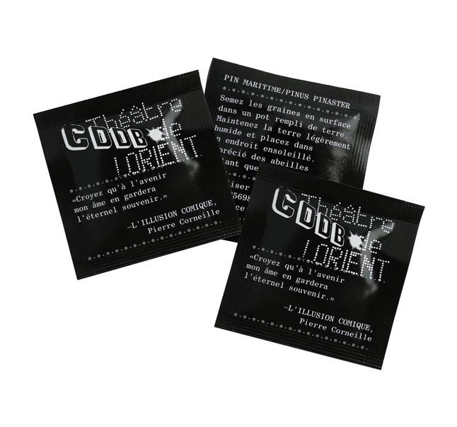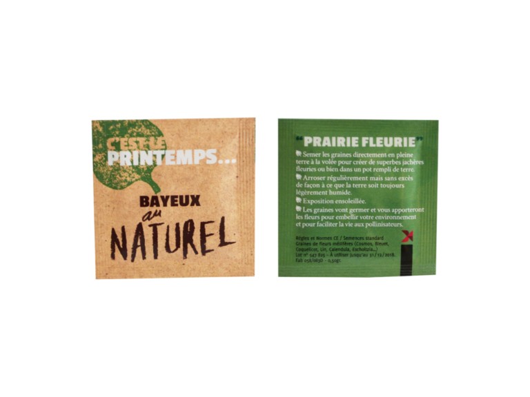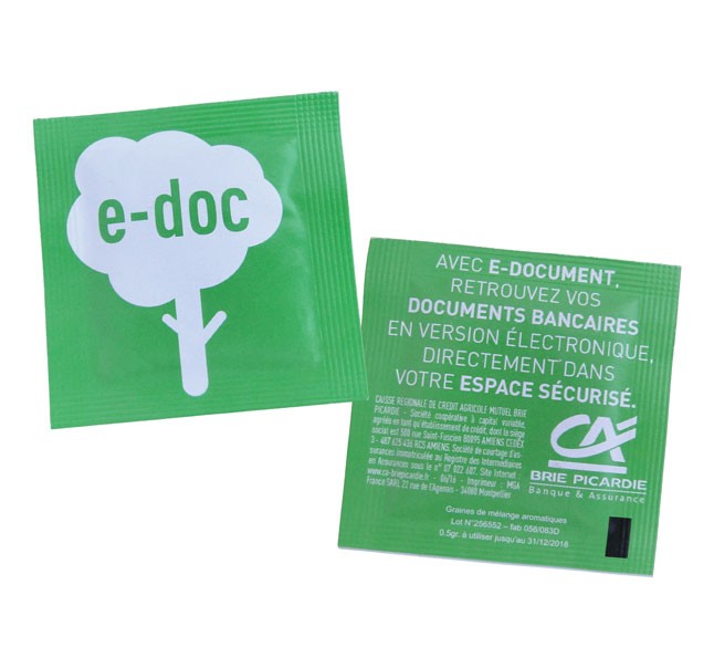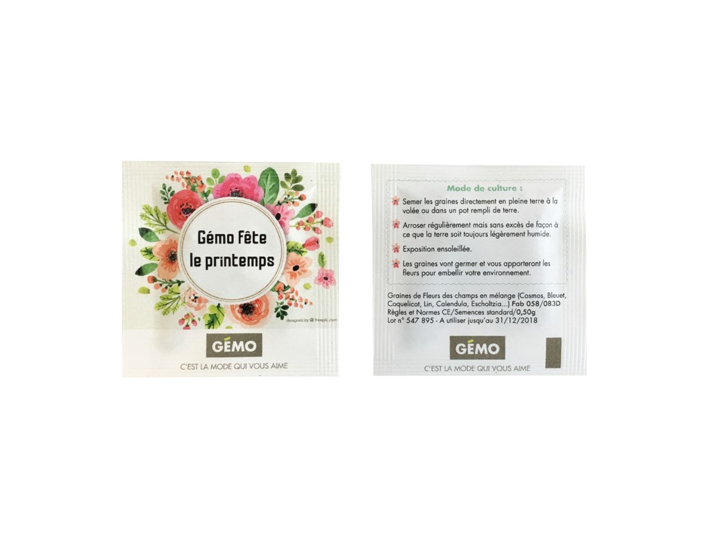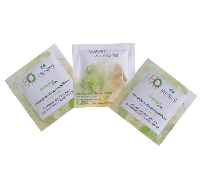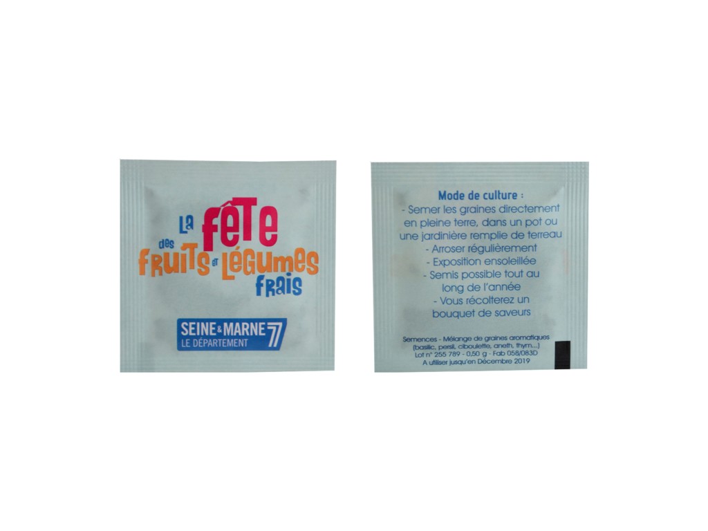 Sachet de graines thermosoudé sur les cotés donc étanche. Choix de graines fleurs : Coquelicot, bleuet, Cosmos, mélange de fleurs mellifères, mélange de fleurs sauvages, mélange de fleurs pour balcon ou aromatiques : Basilic, persil, Ciboulette, Aneth, Coriandre, Cerfeuil , mélange aromatiques.. Un marquage quadri recto/verso et frais techniques inclus
