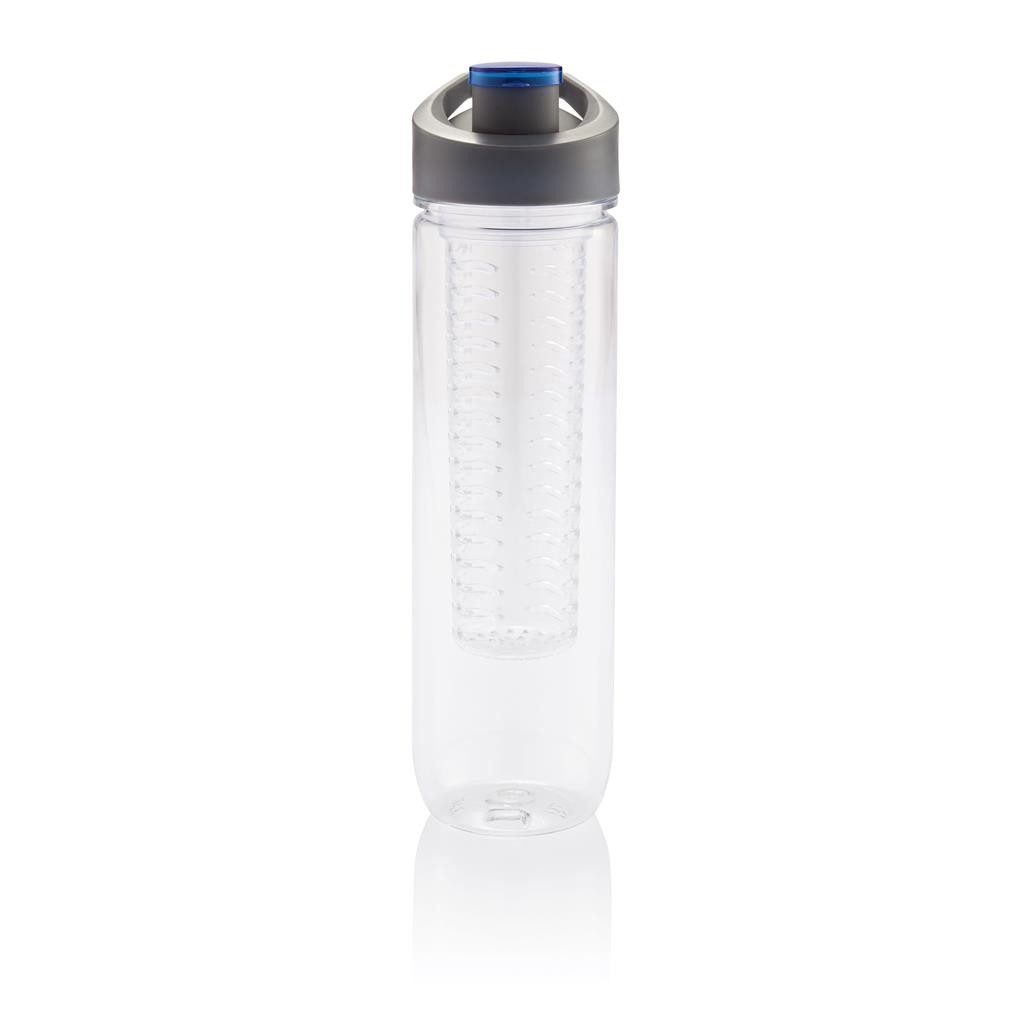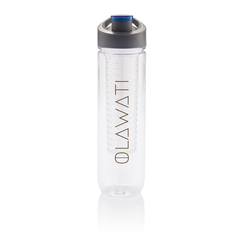 Bouteille 800ml en tritan avec compartiment à infusion. Aromatisez et vitaminez votre eau en ajoutant des fruits frais dans le compartiment à infusion. Remplacez les fruits par des glaçons et votre eau est instantanément rafraîchie. Fabriqué en Chine.