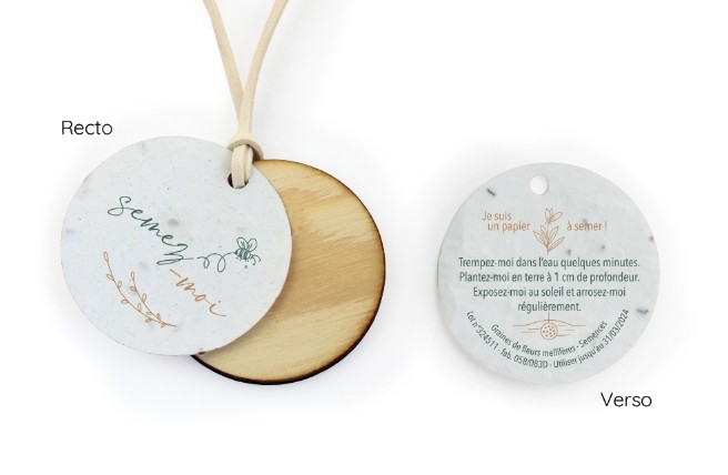 Médaille en bois Ø 50 mm avec cordon de cuir recyclé de longueur 80 cm. Essence de bois : Pin avec papier à graines de fleurs mellifères Ø 50mm, grammage 200 gr avec pictos d’utilisation. Un marquage par gravure laser sur la médaille bois inclus (hors frais techniques).