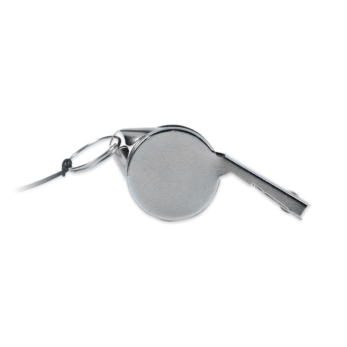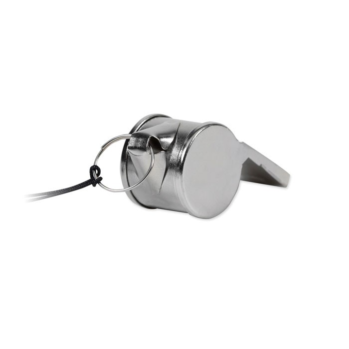 Sifflet en métal attaché à un cordon avec boucle de sécurité.