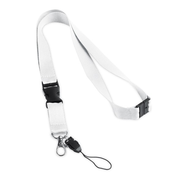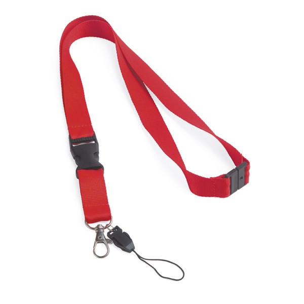 Tour de cou en polyester, avec mousqueton en métal, boucle amovible, dragonne pour téléphone portable et fermeture de sécurité. Fabriqué en Chine.