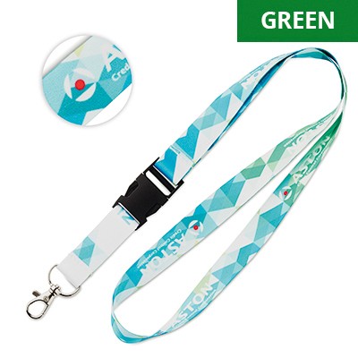 Lanyard en PET recyclé avec crochet métal. Possibilité de boucle sécurité et mousqueton plastique sur demande. Fabriqué en Chine. Sublimation recto/verso et frais techniques inclus.