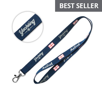 Lanyard plat polyester avec crochet métal. Possibilité de boucle sécurité et mousqueton plastique sur demande. Fabriqué en Chine. Un marquage 1 couleur 1 face et frais techniques inclus.