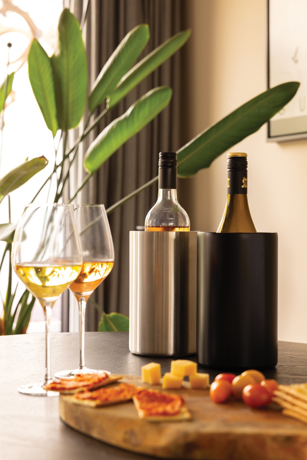 Seau à vin fabriqué en acier inoxydable recyclé certifié RCS. Cette pièce accrocheuse constitue un élément central idéal lorsque vous recevez des invités, vous permettant de refroidir vos vins avec grâce et style. Contenu recyclé total : 91% sur la base du poids total de l’article. Emballé dans un emballage kraft FSC®. Fabriqué en Chine avec empreinte carbone de 2.61 kg/pièce.
