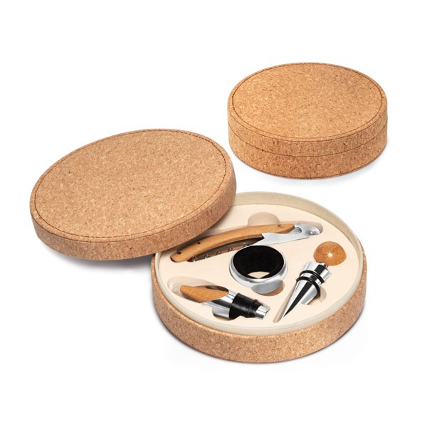 Set à vin avec 4 pièces en bois et métal : un tire-bouchon avec couteau de sommelier, collier anti-gouttes, un verseur anti-gouttes avec bouchon et un bouchon. Fourni sous boîte cadeau en liège. Le produit étant fabriqué à partir de matériaux naturels, la couleur du produit ainsi que le résultat de l’impression peuvent varier d’un produit à l’autre. Fabriqué en Chine.