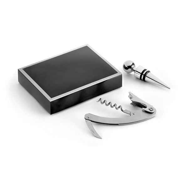 Set à vin en zinc et acier inoxydable. Ce set inclus un tire-bouchon avec couteau de sommelier et un bouchon. Fourni dans un coffret cadeau. Fabriqué en Chine.