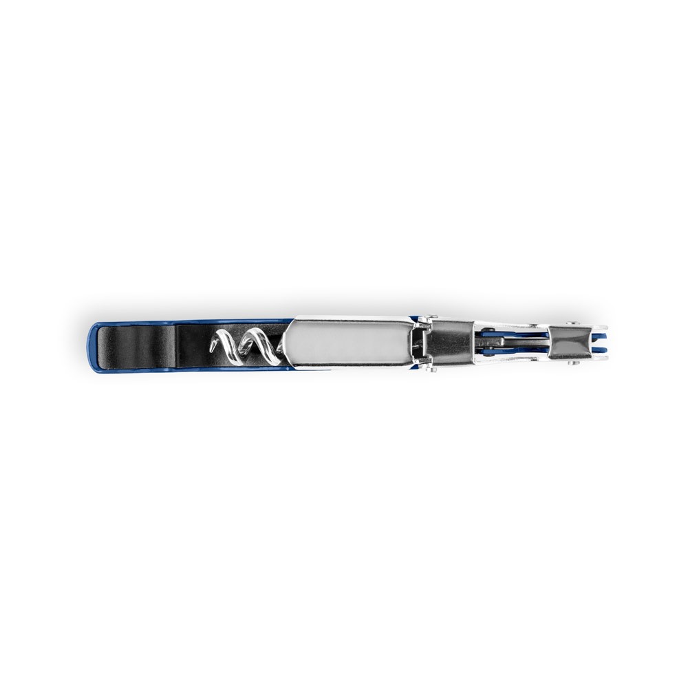 Tire-bouchon en metal et PP avec decapsuleur, couteau de sommelier et spirale en inox. Fabriqué en Chine.