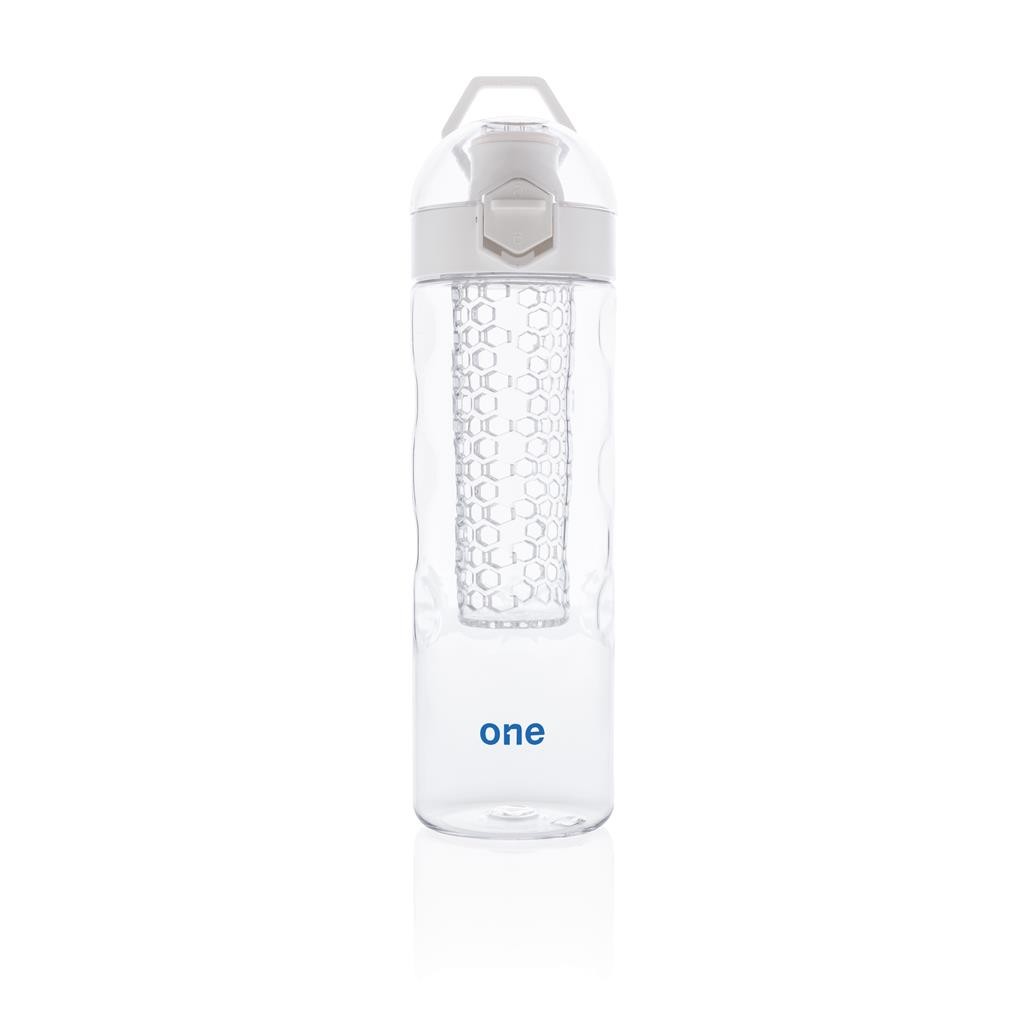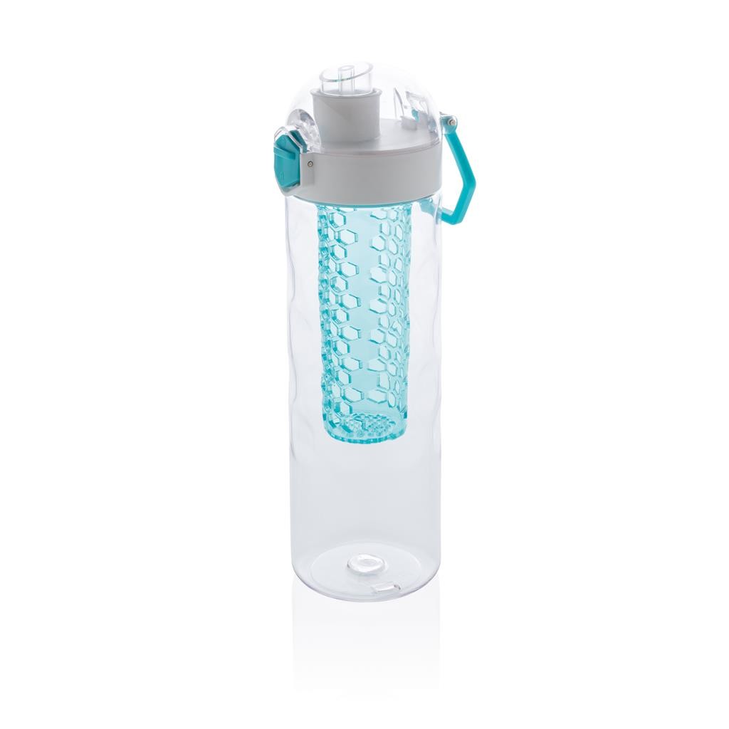 Bouteille à infusion 700ml en tritan et avec design en nid d’abeille. Aromatisez et vitaminez votre eau en ajoutant des fruits frais dans le compartiment à infusion. Bouchon avec verrouillage spécialement conçu pour éviter que la bouteille s’ouvre par accident. Poignée de transport incluse. Modèle déposé®. Fabriqué en Chine.