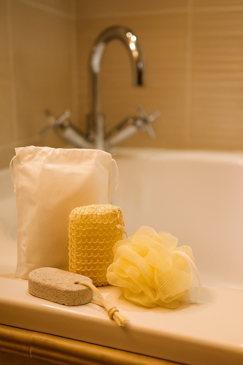 Ensemble d’accessoires de bain 3 pièces comprenant une boule de bain/un luffa, une pierre ponce et une éponge en sisal. Taille de la boule de bain/du luffa : 9 cm. Taille de la pierre ponce : 9,5 x 4,5 x 1,5 cm. Taille de l’éponge en sisal : 14 x 8 x 5 cm. Livré dans une pochette en polyester. 20% Sisal et 20% Silicone et 60% Polyester. Fabriqué en Chine.