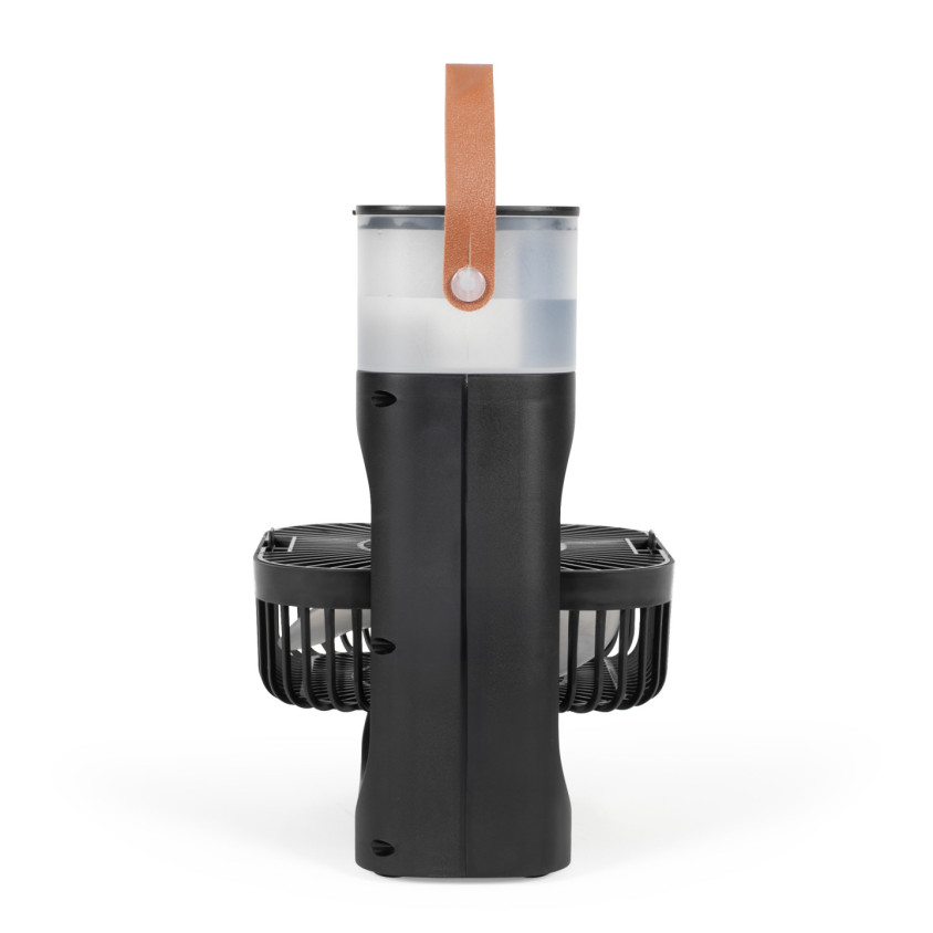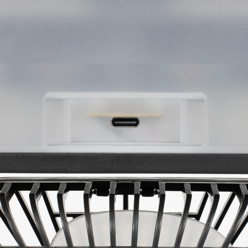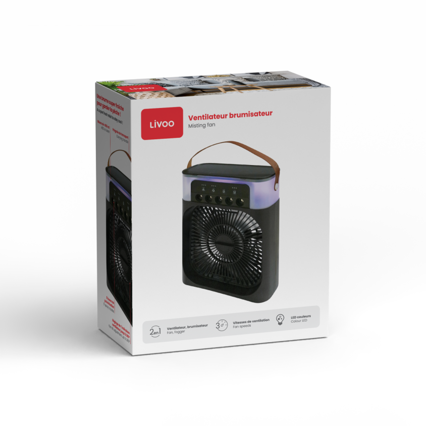 2 en 1 : ventilateur et brumisateur. Fonctions brumisation et ventilation indépendantes, 3 vitesses, Ø 15 cm et puissance : 10 W. Réglage de l’inclinaison du ventilateur jusqu’à 360°, 3 niveaux de brumisation et autonomie du réservoir de 9h pour une utilisation continue sans rechargement en eau. 5 buses de pulvérisation, brumisation : 225 ml/h max. et capacité du réservoir d’eau : 450 ml. Minuterie jusqu’à 3 h par tranche de 1 h, éclairage d’ambiance LED en couleurs, poignée de transport et fonctionnement par câble d’alimentation USB type C inclus.