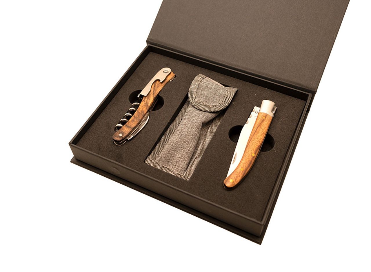 Coffret cadeau composé d’un couteau pliant 11cm et d’un sommelier. Manches en frêne exotique.