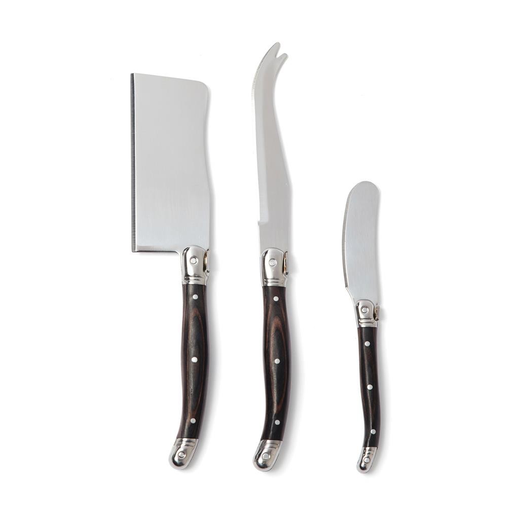 Ensemble exclusif de couteaux à fromage en acier inoxydable, composé de deux couteaux à fromage et d’un couteau à beurre avec un manche en Pakkawood noir. Emballé dans une boîte cadeau exclusive.