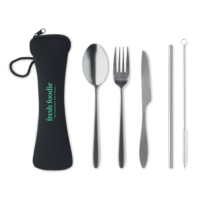 Ensemble de couverts réutilisables en acier inoxydable que vous pouvez facilement emporter partout et qui sont parfaits pour apporter votre déjeuner au travail. Ce set comprend une fourchette, un couteau, une cuillère, une paille et une brosse, afin que vous puissiez nettoyer la paille. Tous les articles tiennent dans la pochette en néoprène avec fermeture à glissière et cordon de fermeture.