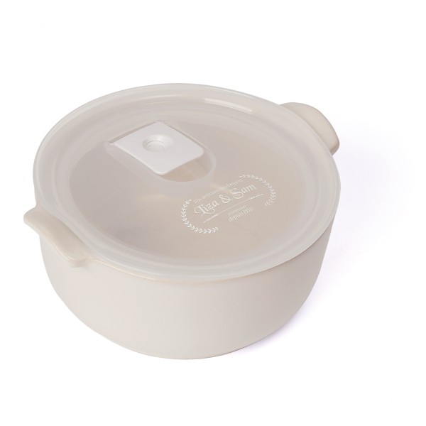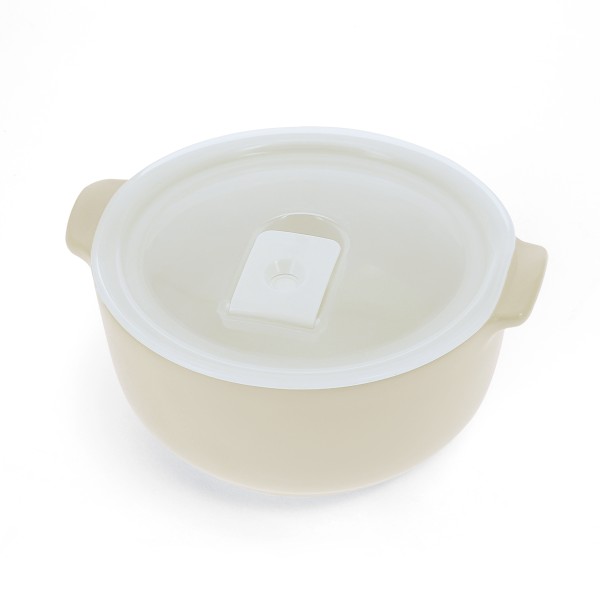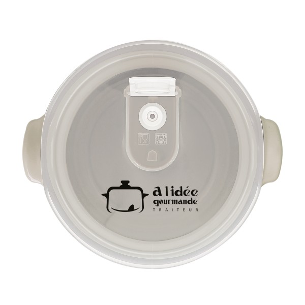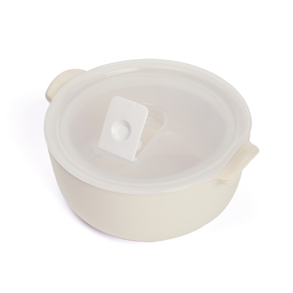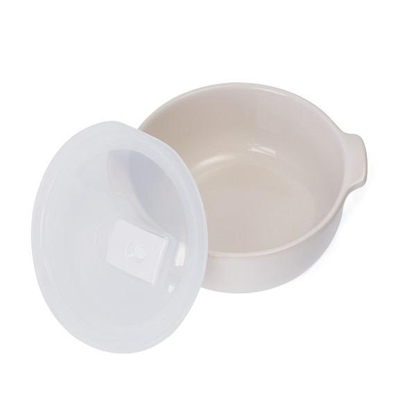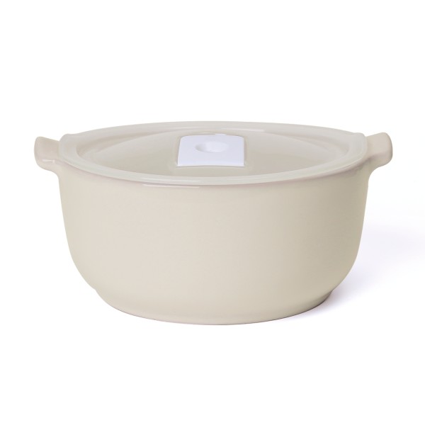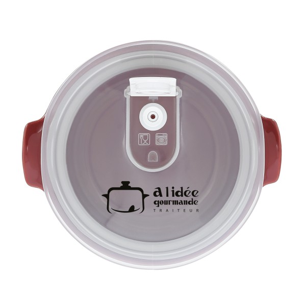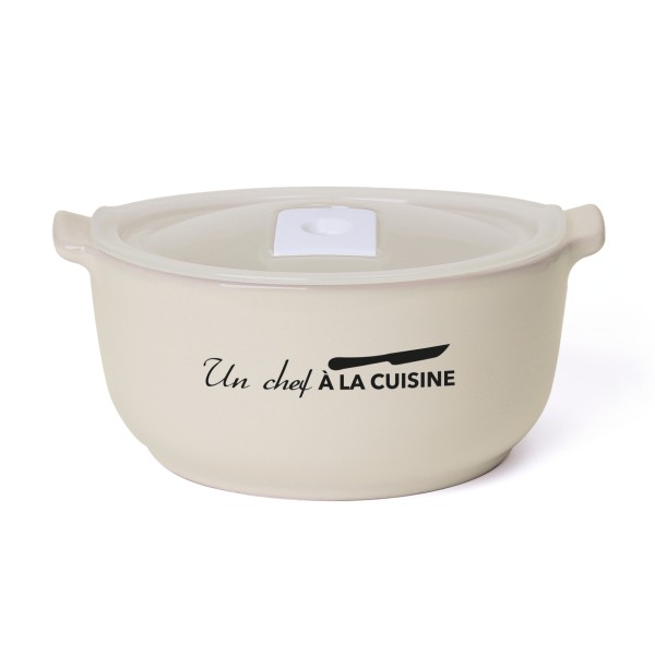 Lunch box en céramique. Couvercle hermétique. Cuisson au four traditionnel (sans couvercle) ou au four micro-ondes avec couvercle (valve ouverte). La quantité minimale de commande sur ce produit est de 300 pièces avec un délai de 4 semaines minimum. Un marquage 1 couleur 1 position et frais techniques inclus.