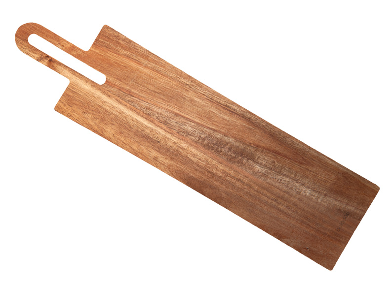Acacia massif. Large trou dans le manche pour accrocher la planche sur un mur. Peut aussi servir comme planche de présentation. L’acacia est l’un des bois les plus adaptés aux planches de cuisine en raison de sa dureté et de sa résistance à l’humidité. Une longueur XL de 60cm visuellement impressionnante permettant d’en faire aussi une superbe planche de présentation. Fabriqué en Chine.