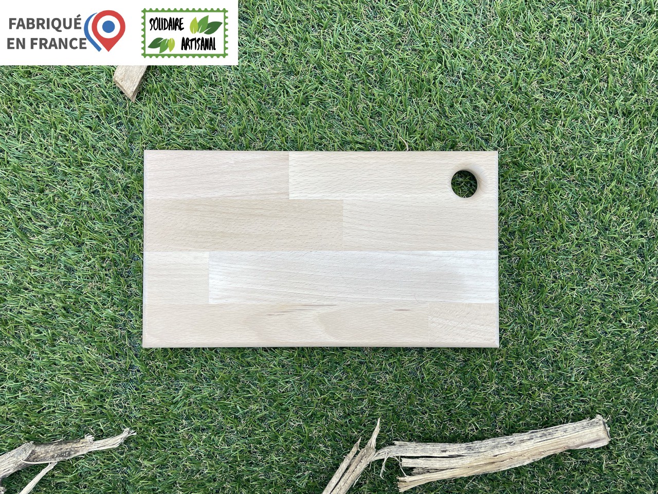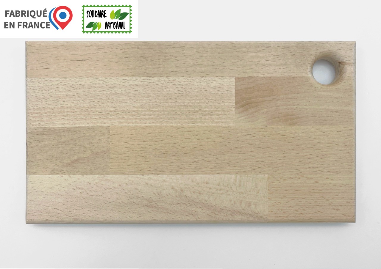Planche a découper en hêtre avec petite gravure au dos de chaque produit « Fabriqué en France ». Fabriqué en France par un chantier d’insertion. Un marquage laser 1 position et frais techniques inclus.