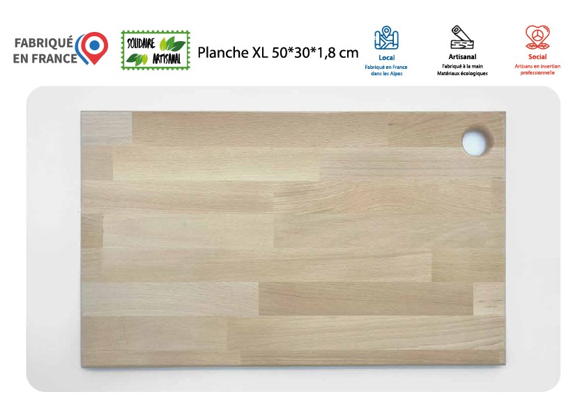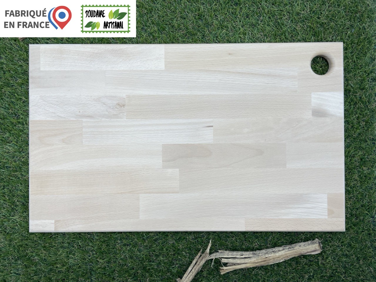 Planche a découper en hêtre avec petite gravure au dos de chaque produit « Fabriqué en France ». Fabriqué en France par un chantier d’insertion. Un marquage laser 1 position et frais techniques inclus.