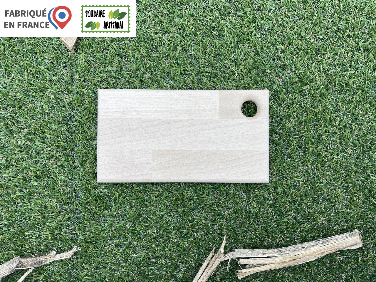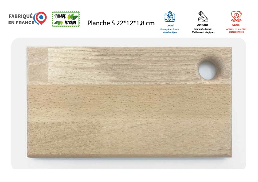 Planche a découper en hêtre avec petite gravure au dos de chaque produit « Fabriqué en France ». Fabriqué en France par un chantier d’insertion. Un marquage laser 1 position et frais techniques inclus.