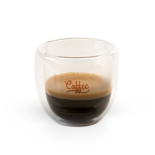 Service à café en verre isotherme avec 2 verres doublement isolés par l’air d’une capacité allant jusqu’à 75ml. Livré dans une boîte cadeau personnalisée. Fabriqué en Chine.