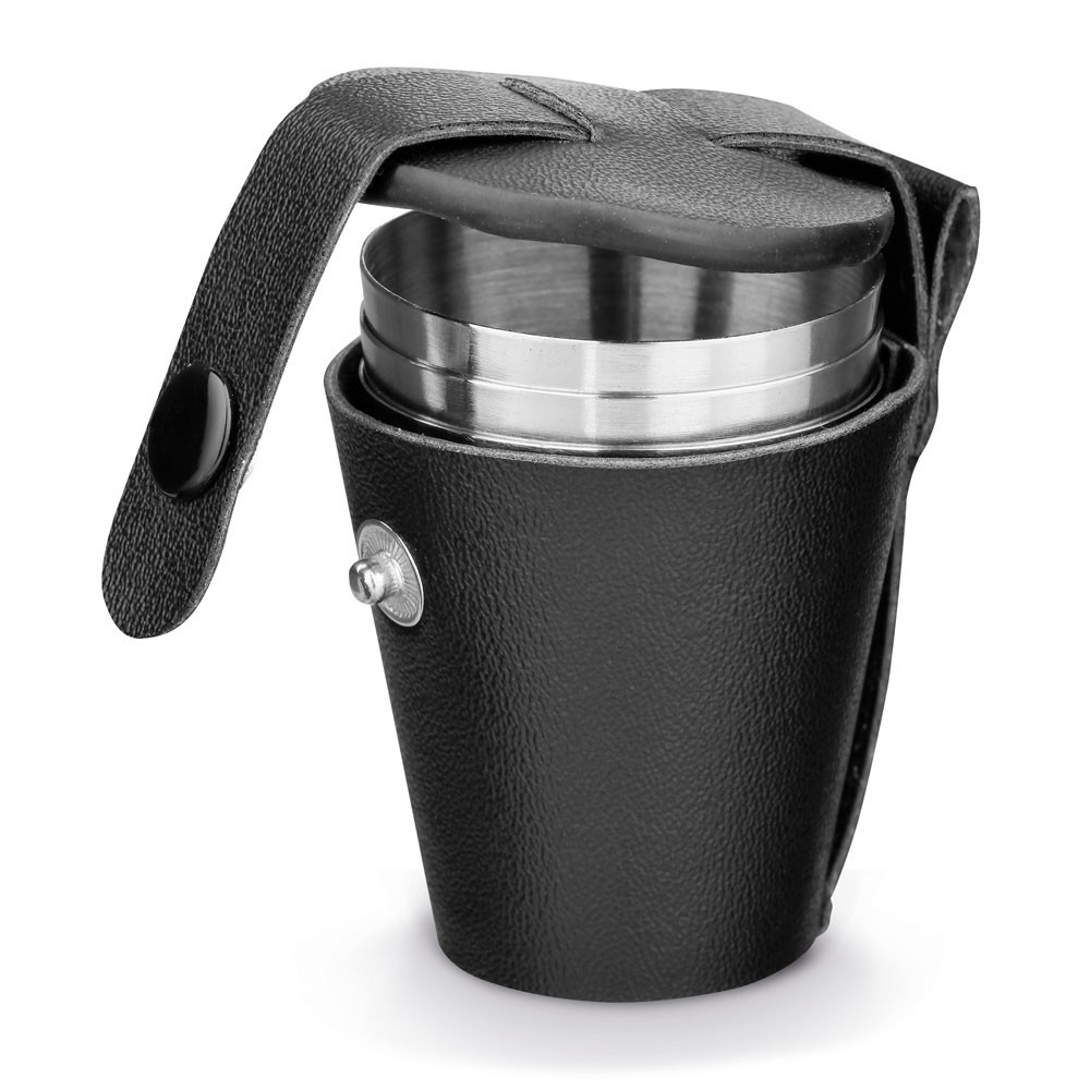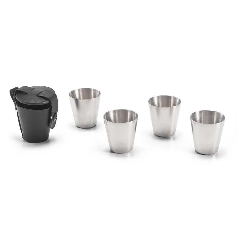 Set de 4 gobelets en acier inoxydable dans une pochette de transport en PU. La capacité des gobelets est de 25 mL. Livré dans un coffret cadeau. Fabriqué en Chine.