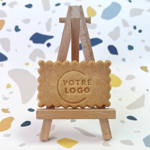 Biscuits de 10gr avec ingrédients naturels (farine de blé, beurre, sucre blanc, sucre glace, œufs) et sans conservateur. Allergènes : Présence dans l’atelier de fabrication de fruits à coque, arachides, produits laitiers, blé, œuf. Conservation pendant 6 mois avec possibilité d’autres parfums sur demande (caramel beurre salé et citron). Livré sous conditionnement individuel d’origine végétale, biodégradable et compostable. Possibilité de boites surmesure avec 4 / 6 / 12 ou 24 biscuits. Un marquage en creux 1 face et frais techniques inclus.