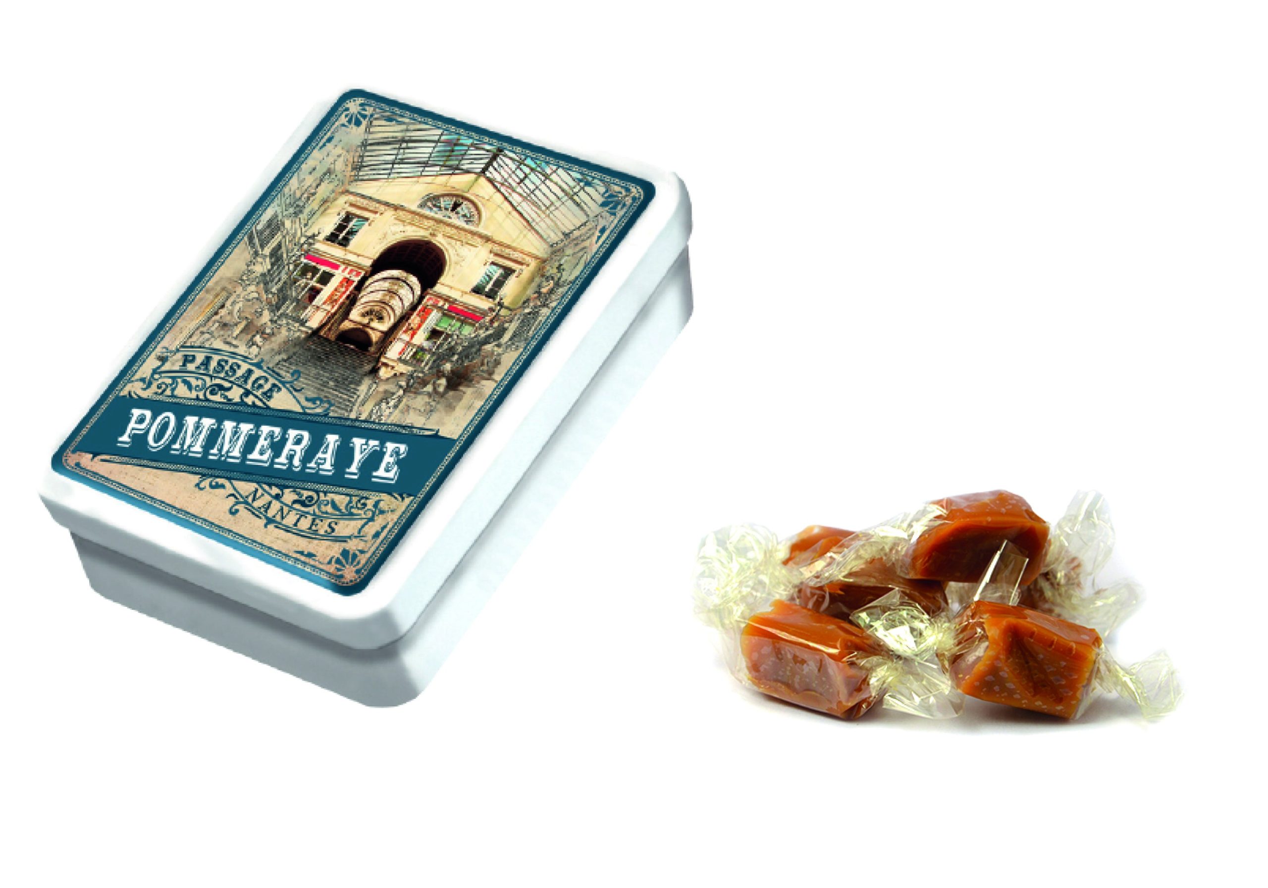 Boite 1/2 sucrette avec boite caramel beurre salé 100gr, délai de conservation de 12 mois. Impression du couvercle uniquement (sur demande).