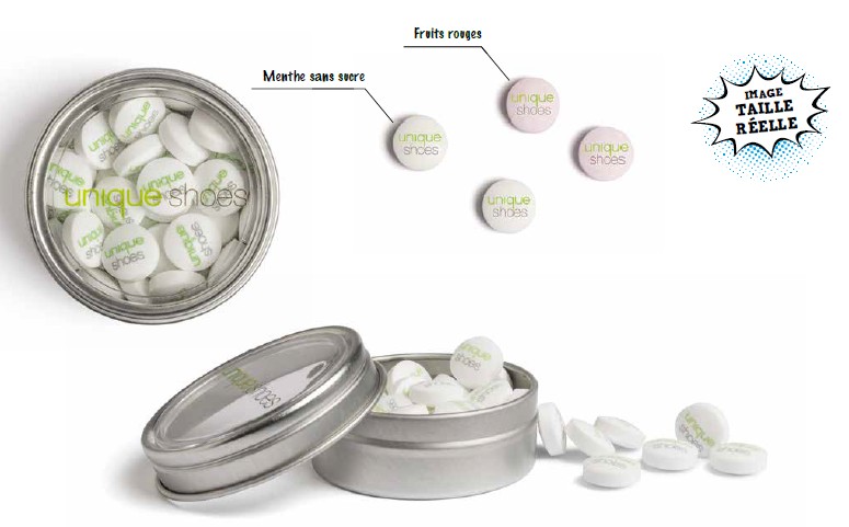 Boîte métal à fenêtre avec garniture menthe sans sucre ou fruits rouges. Impression numérique sur le couvercle. Encres comestibles pour l‘impression sur les bonbons conformément à la réglementation alimentaire européenne / Encres non Azoïques. Fabriqué en France.