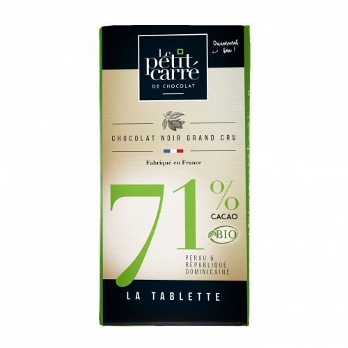 Un goût intense en cacao avec des notes de fruits rouges en fin de bouche. Le chocolat 71% Bio est un chocolat très agréable avec une belle fluidité. Ce chocolat apprécie particulièrement les accords avec les fruits rouges tels que la groseille ou la framboise. A conserver dans un endroit frais et sec sans odeur entre 12 et 18°C, DLUO : 24 mois. Papier FSC 100g avec impression quadri recto à base d’encre végétale et frais techniques inclus.
