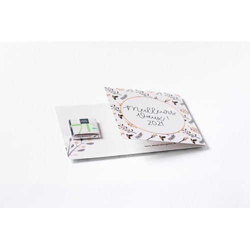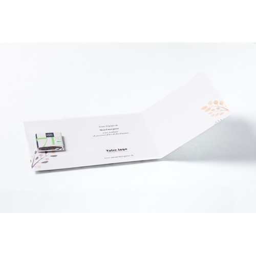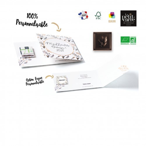 Carte personnalisable 300g de dimension ouverte 268x110mm avec impression quadri recto-verso à base d’encre végétale sur un carton FSC. Carré de chocolat 4gr avec un goût intense en cacao avec des notes de fruits rouges en fin de bouche. Le chocolat 71% Bio est un chocolat très agréable avec une belle fluidité. Ce chocolat apprécie particulièrement les accords avec les fruits rouges tels que la groseille ou la framboise. A conserver dans un endroit frais et sec sans odeur entre 12 et 18°C, DLUO : 24 mois.