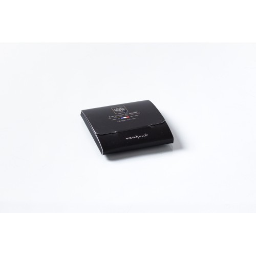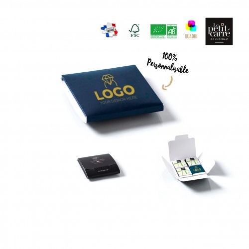 Carte personnalisable 300g de dimension ouverte 120x156mm avec impression quadri recto à base d’encre végétale sur un carton FSC. 4 carrés de chocolat 4gr avec un goût intense en cacao avec des notes de fruits rouges en fin de bouche. Le chocolat 71% Bio est un chocolat très agréable avec une belle fluidité. Ce chocolat apprécie particulièrement les accords avec les fruits rouges tels que la groseille ou la framboise. A conserver dans un endroit frais et sec sans odeur entre 12 et 18°C, DLUO : 24 mois.
