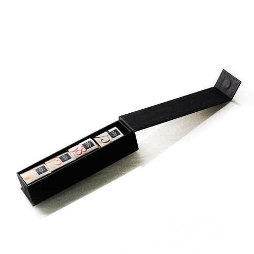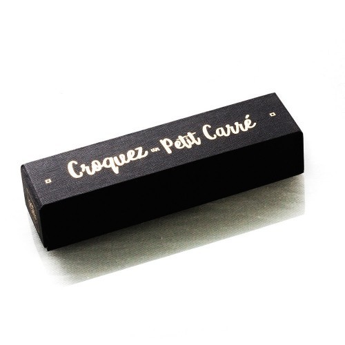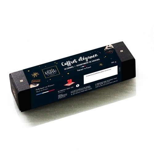 16 carrés dégustation de 5g chacun. Assortiment de saveurs : Tanzanie 75%, Mexique 68%, Gianduja, lait 42%. DLUO de 24 mois pour le chocolat noir et 18 mois pour le chocolat lait. Possibilité de personnaliser le coffret en dorure. Fabriqué en France.