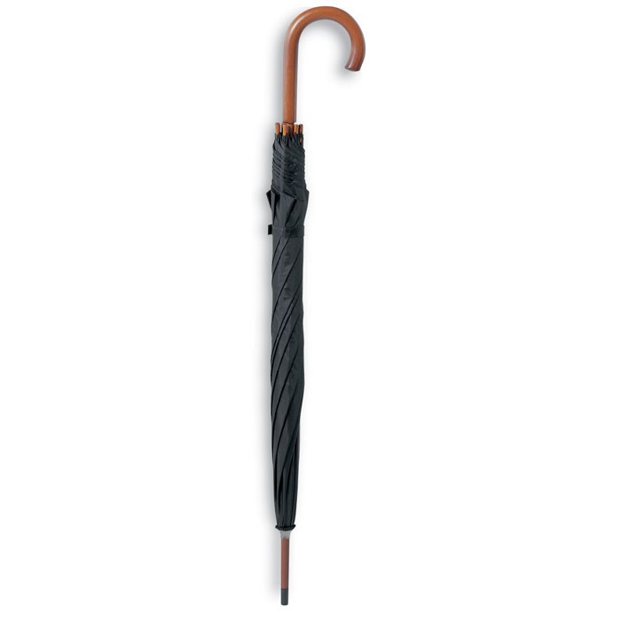 Parapluie en PE 190 T avec manche et poignée en bois. Ouverture manuelle. Diam 100 cm. Long. mât 60 cm. Fabriqué en Chine.