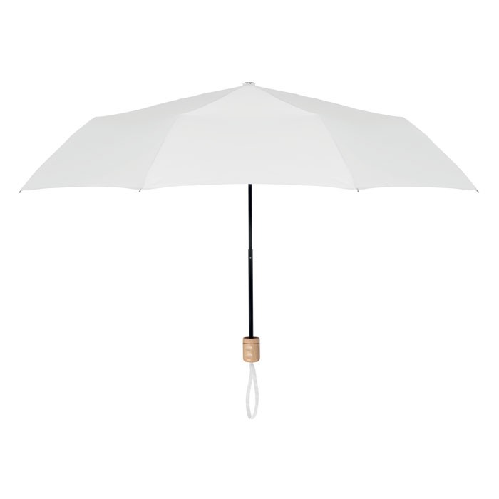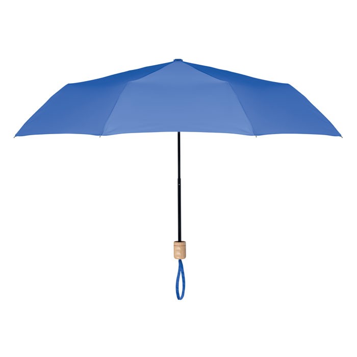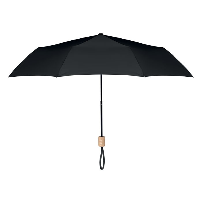 Parapluie pliable de 21 », attributs en pongé 190T RPET, mât et baleines en métal plaqué noir et manche en bois. Ouverture et fermeture manuelles. Pochette individuelle et fabriqué en Chine.
