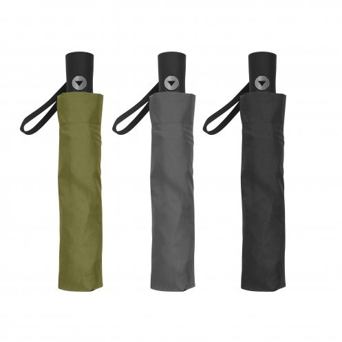 Parapluie pliable 100% polyester pongé 190T, à ouverture automatique. Structure en fibre de verre, mât et embouts en métal, manche rubber.