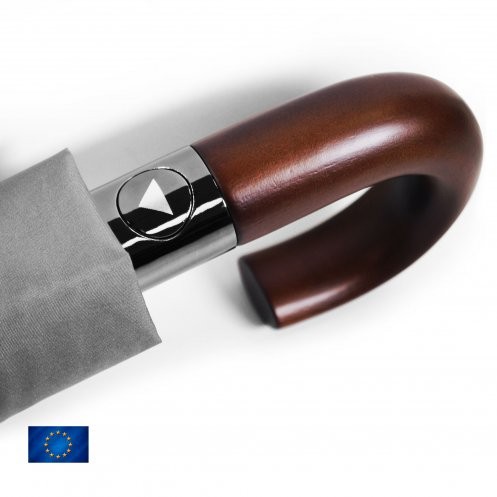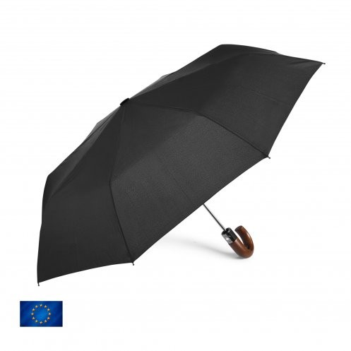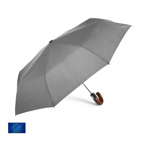 Parapluie pliable 100% polyester recyclé (RPET) avec ouverture automatique. Structure en fibre de verre, mât et embouts en métal, manche courbe en bois foncé. Fabriqué en Croatie avec empreinte carbone de 7.25kg équivalent CO².