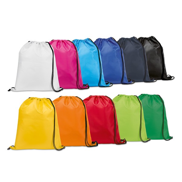Sac à cordelettes en 210D avec cordon noir pour le fermer. Disponible dans une large gamme de couleurs. Fabriqué en Chine.