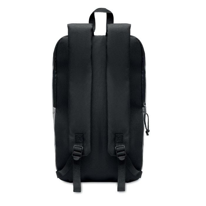 Sac à dos avec le devant en polyester hautement réfléchissant, une poche extérieure zippée et pour plus de confort une partie arrière rembourrée en polyester 600D.