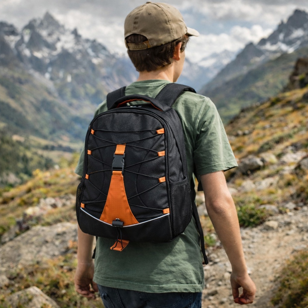 Sac à dos noir avec façade en couleur contrastée. Polyester 600D. Cordon de décoration sur le devant. Poches filet sur les deux côtés.