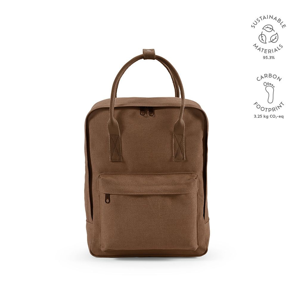 Fabriqué en toile de coton recyclé 450 g/m², ce sac à dos est un exemple de durabilité avec sa capacité de 18 litres. Il est doté de deux poignées positionnées de manière pratique et de bretelles en rPET. Il possède également une poche frontale. Emballé dans un sac en polyéthylène recyclé. Fabriqué en Chine avec empreinte carbone de 3.12kg CO²eq.
