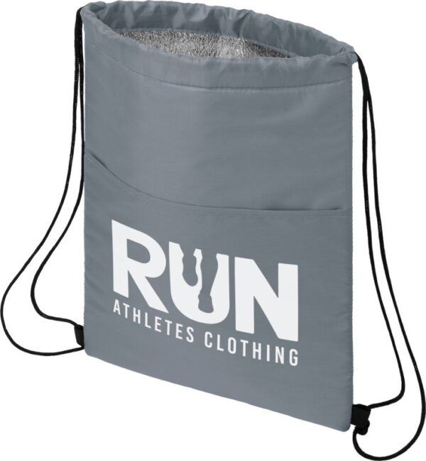 Sac isotherme doté d’une fermeture à cordon de couleur noire. Dispose d’une poche avant ouverte. Capacité de 12 canettes. Capacité de charge maximale de 5 kg. 210D Polyester.