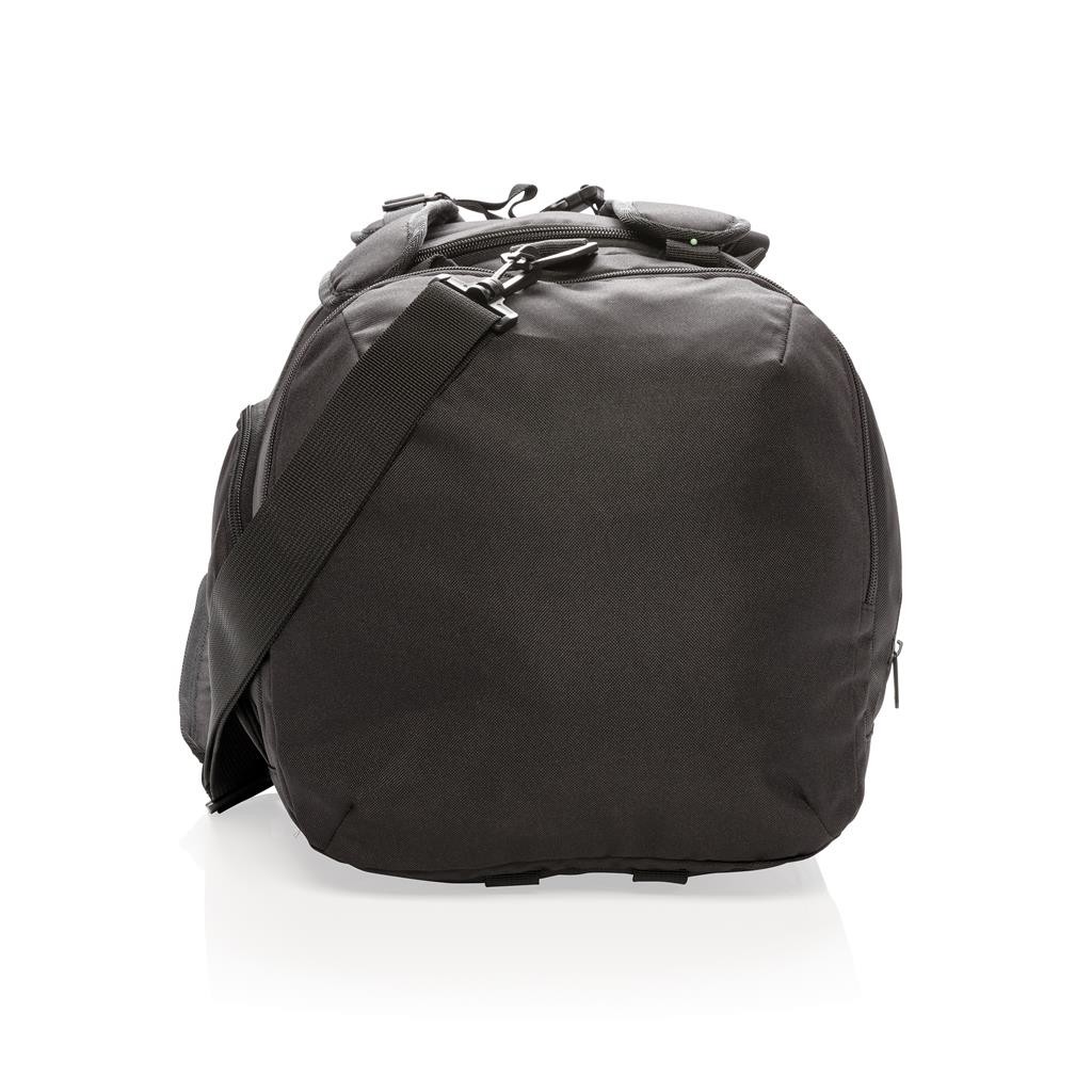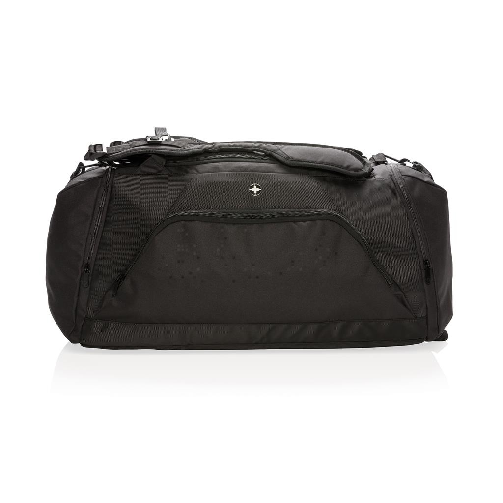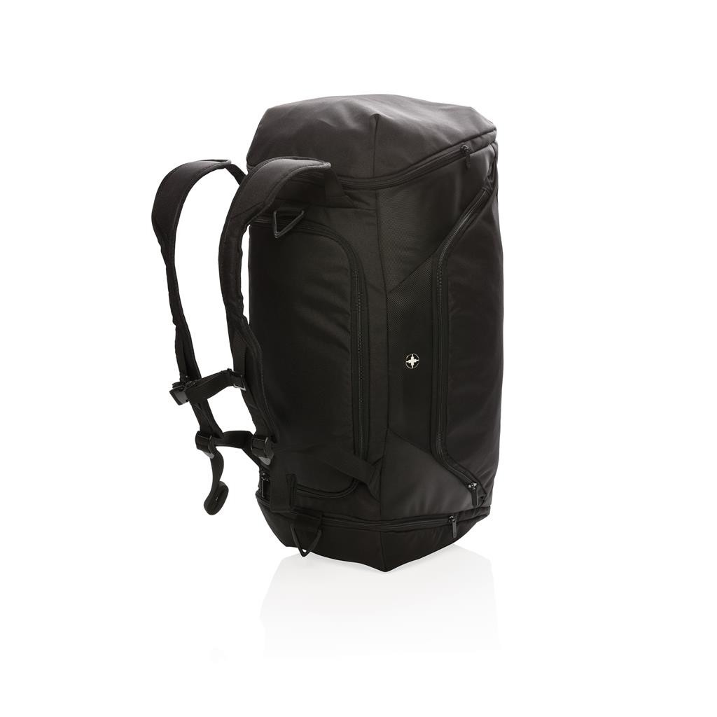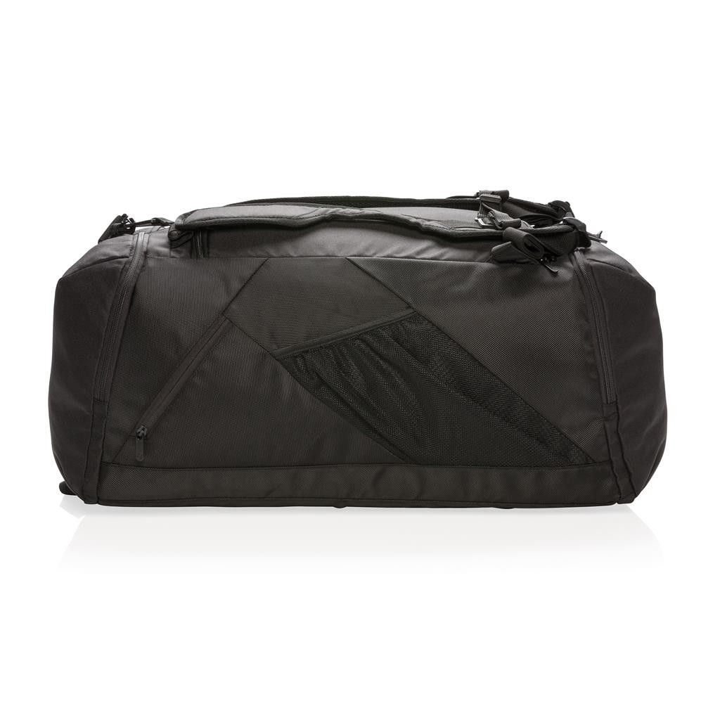 Sac 2-en-1 en polyester 1680D et 600D ultraléger, convertible en sac à dos ou sac de sports. Compartiment principal spacieux avec fermeture éclair en forme de U, ouverture sur le côté pour un compartiment à chaussures ou vêtements sales et poche latérale zippée. Au dos, poche porte-bouteille et poche à accès facile. Poche frontale à fermeture éclair avec deux compartiments avec protection RFID. Bretelles ajustables pour plus de confort. Sans PVC. Fabriqué en Chine.
